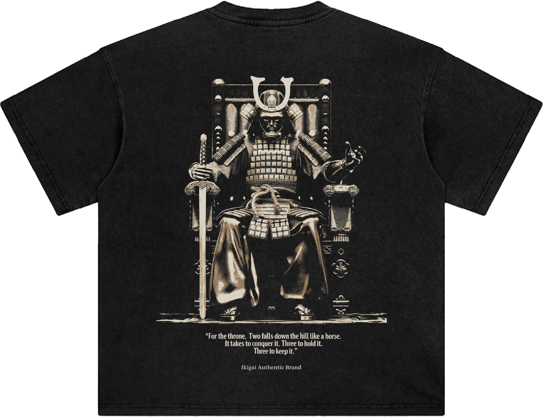 Command attention with this Samurai Throne Tee, featuring a powerful armored warrior seated in authority. Vintage tones and a striking quote capture the spirit of strength, ambition, and legacy. Crafted for those who lead with honor—by Ikigai Authentic Brand.