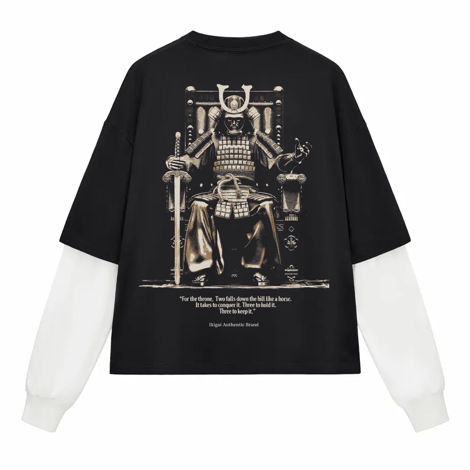 Command attention with this Samurai Throne Tee, featuring a powerful armored warrior seated in authority. Vintage tones and a striking quote capture the spirit of strength, ambition, and legacy. Crafted for those who lead with honor—by Ikigai Authentic Brand.