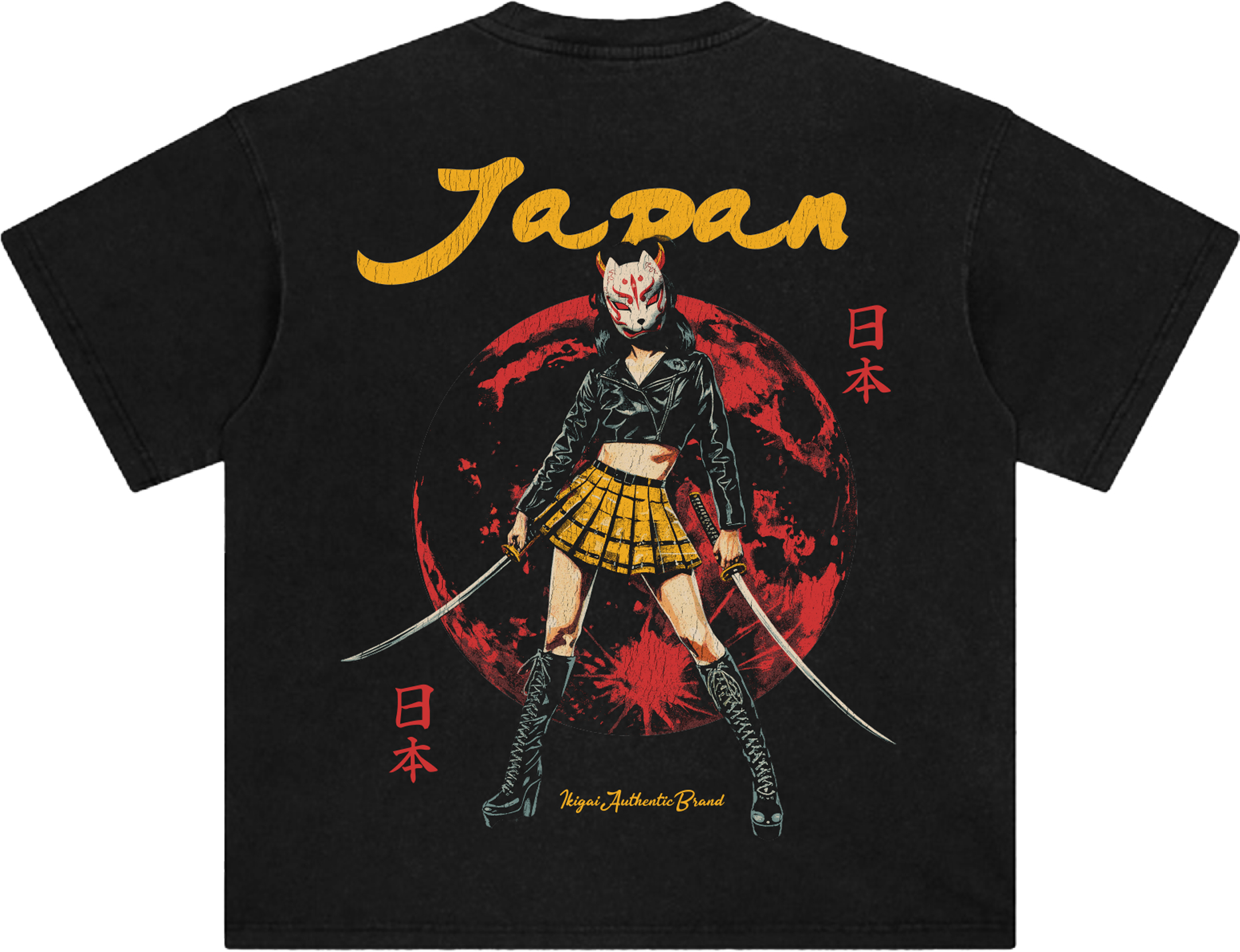 Unleash your inner rebel with this Japan Oni Girl Tee, featuring a fierce masked warrior, dual katanas, and a bold red moon backdrop. Striking colors and Japanese kanji bring a unique streetwear edge. Made from premium cotton for comfort and attitude.