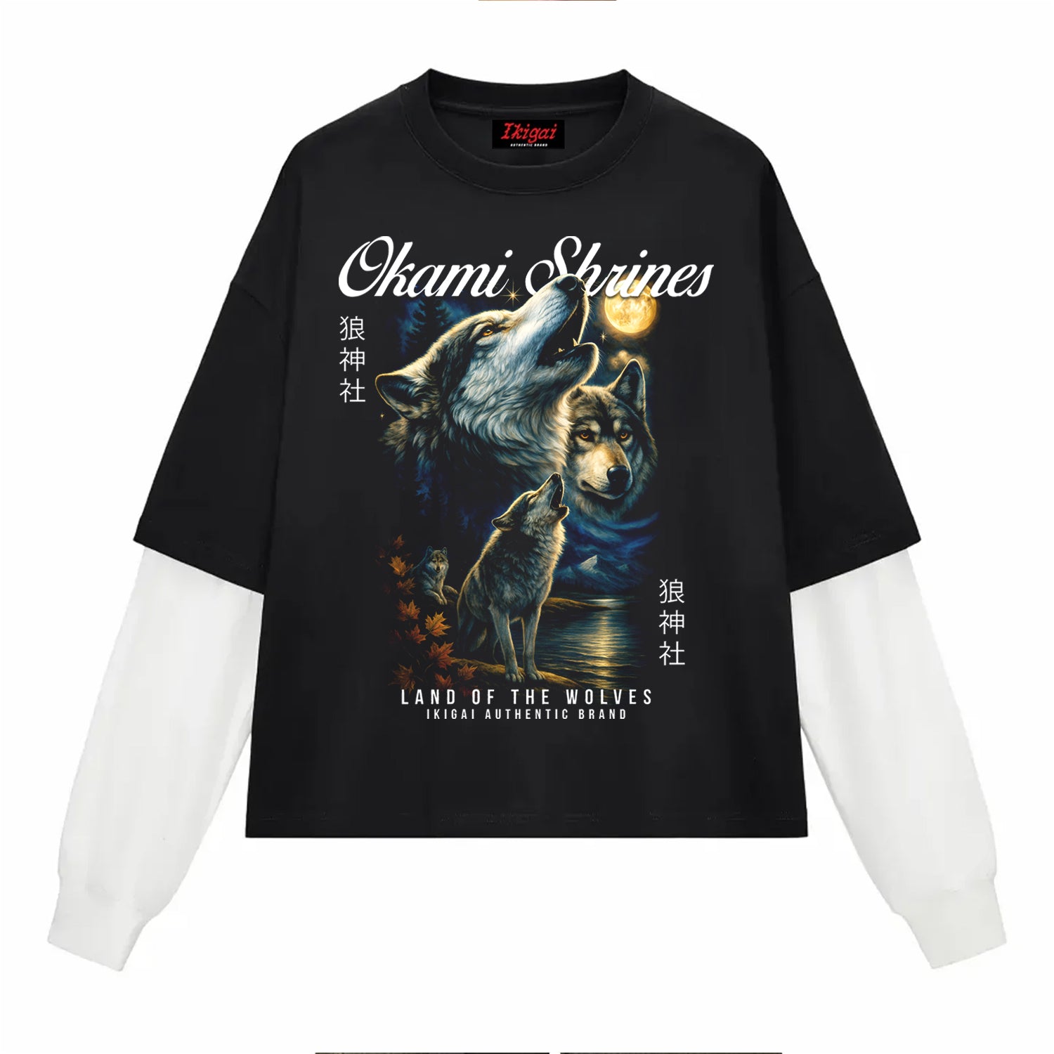 Okami Wolves Layered Contrast Sleeve Cotton T-Shirt =