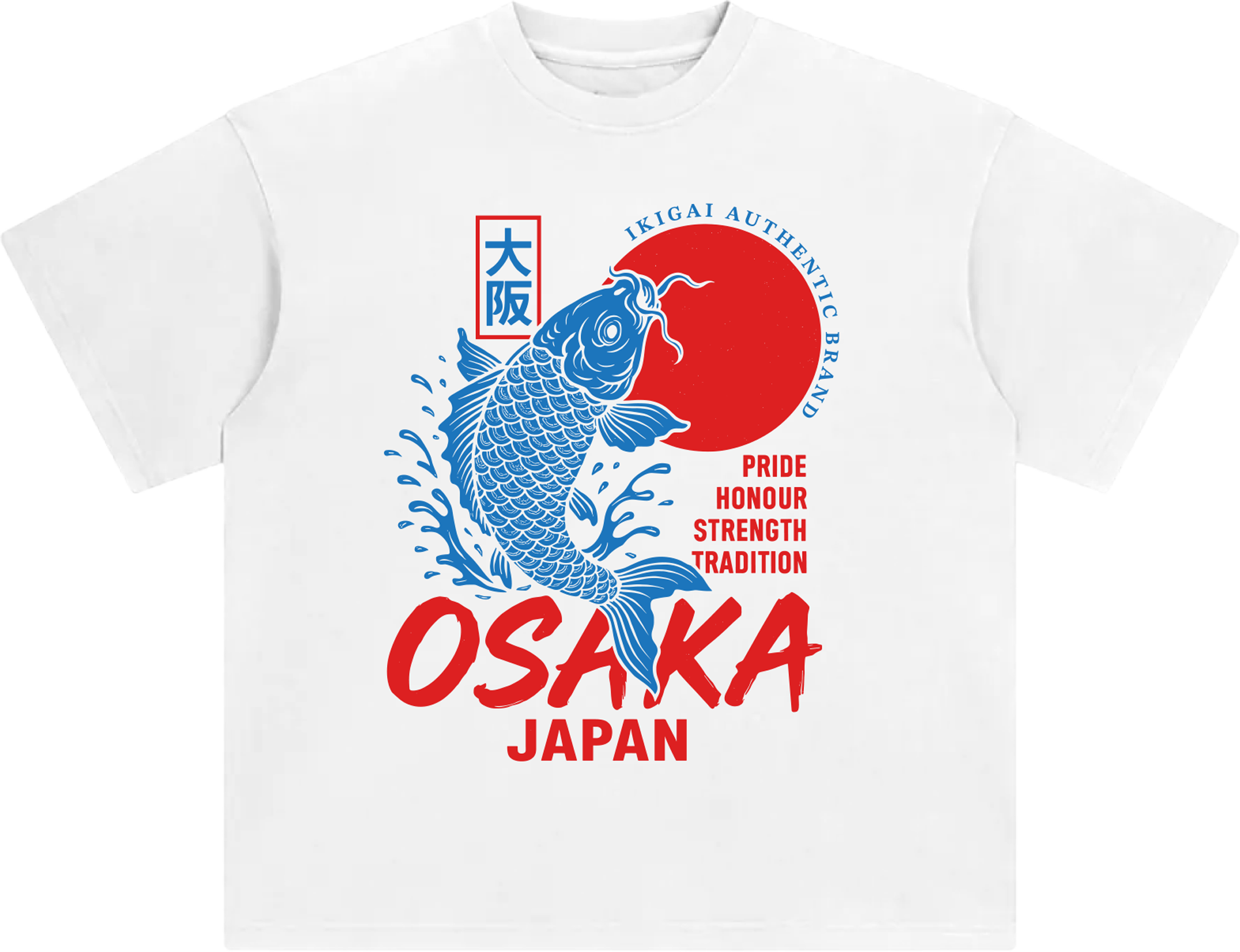 Celebrate Japanese tradition with this Osaka Koi Tee, featuring a bold blue koi fish and vibrant red sun graphic. Highlighted by powerful words like "Pride," "Honour," and "Strength," this design stands out in any streetwear collection. Crafted from premium cotton for all-day comfort and style.