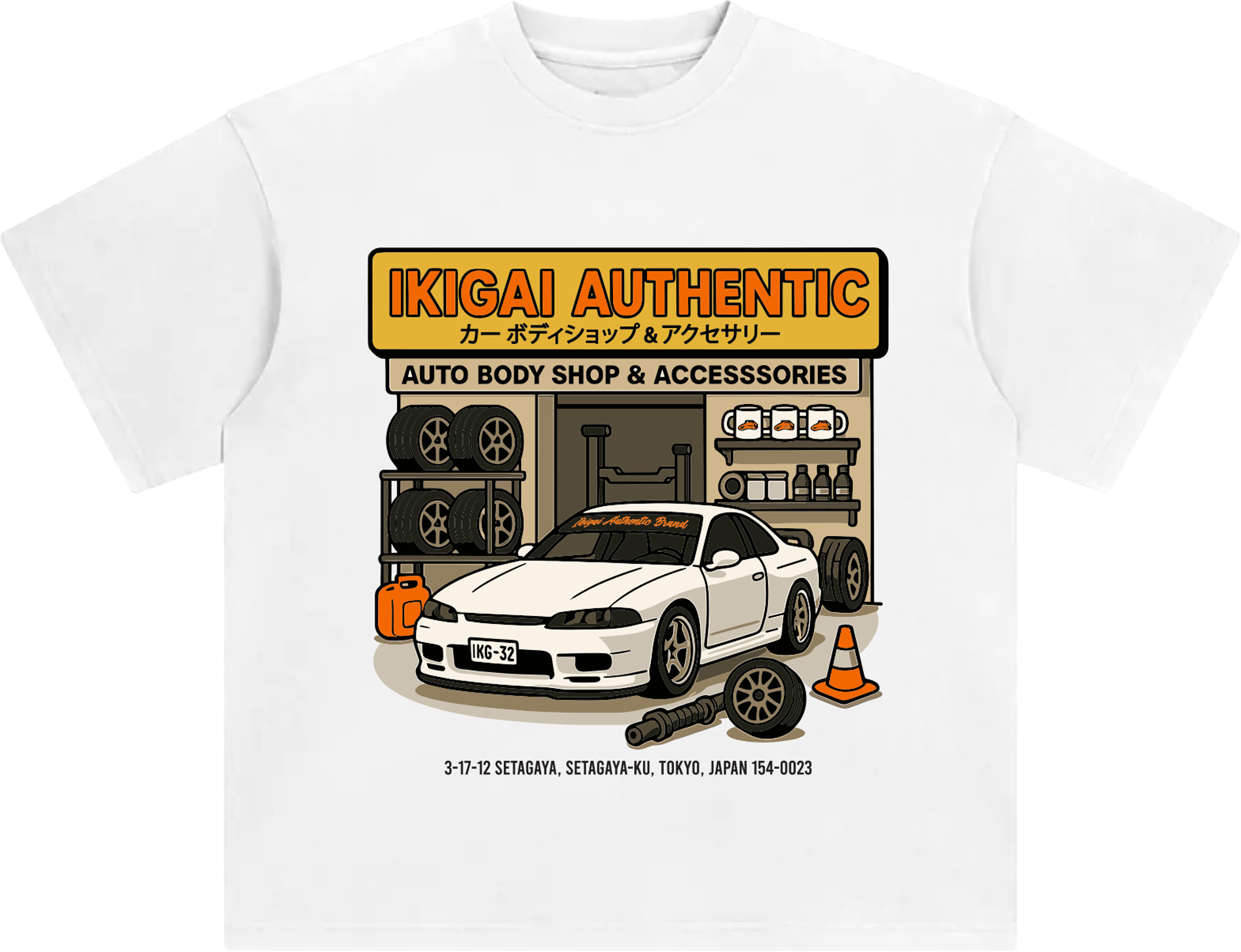 Rev up your style with this Ikigai Authentic Auto Body Shop Tee, featuring a classic JDM car and detailed garage scene. Bold graphics and Japanese text bring true street culture vibes. Perfect for car lovers and anyone who lives for the automotive lifestyle.