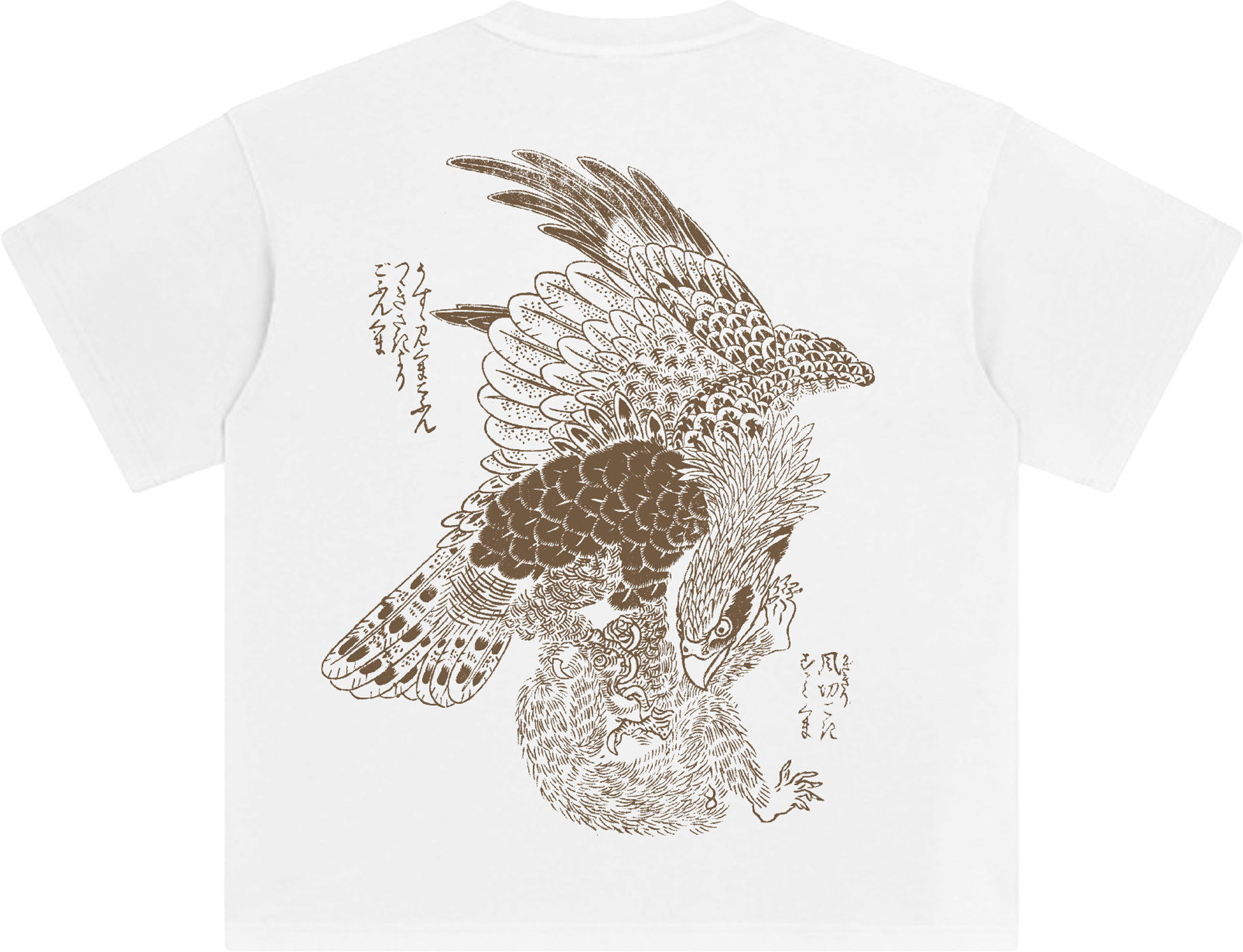 Make a statement with this Japanese Eagle Tee, featuring a detailed vintage-style eagle graphic and authentic kanji script. The bold brown line art on crisp white cotton brings classic tradition to modern streetwear. Perfect for those who appreciate heritage and standout design.