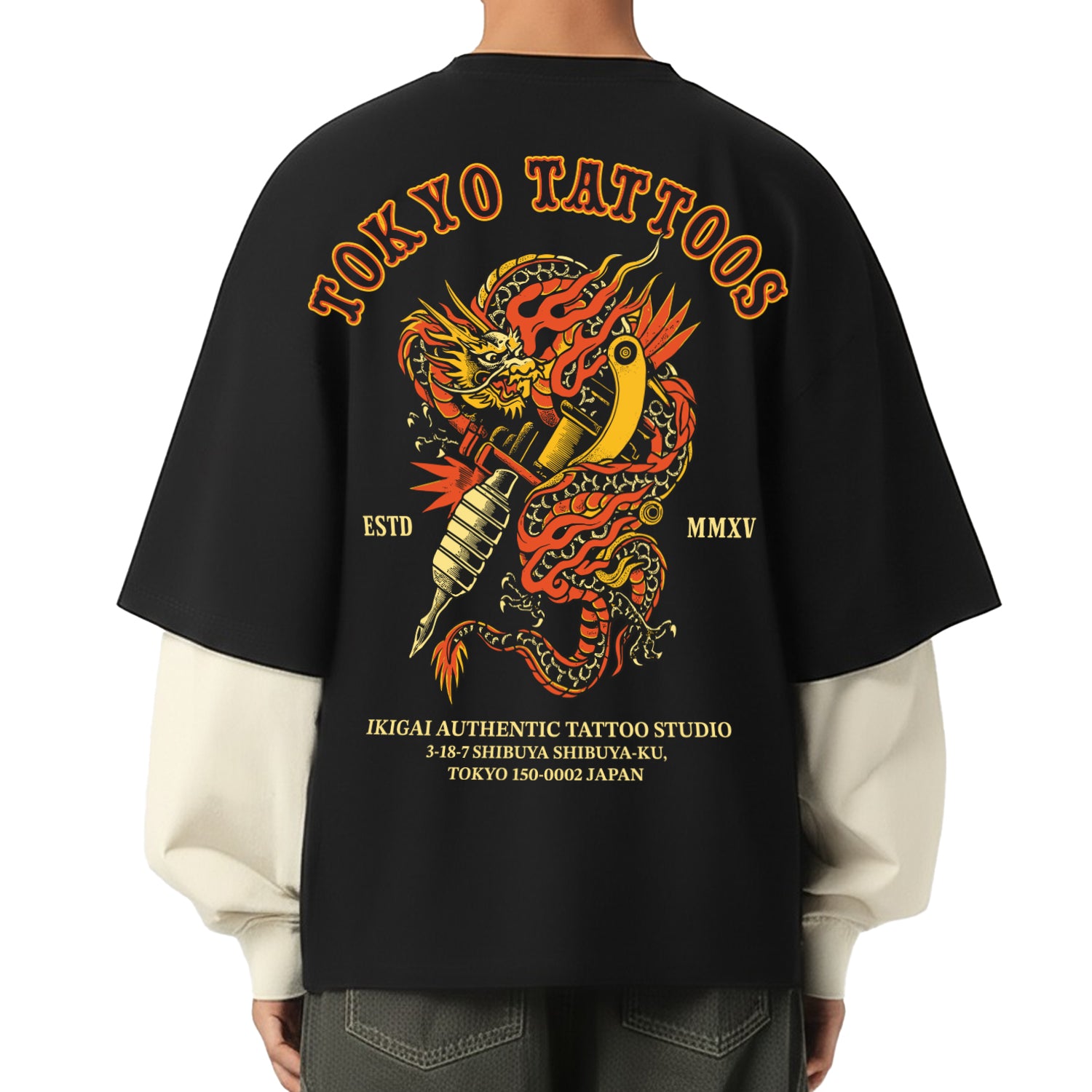 Show off bold style with this Tokyo Tattoos Tee, featuring a fiery Japanese dragon wrapped around a classic tattoo machine. Vintage lettering and authentic studio details give it a true street-meets-tattoo shop vibe. Perfect for those who live for art, ink, and attitude.