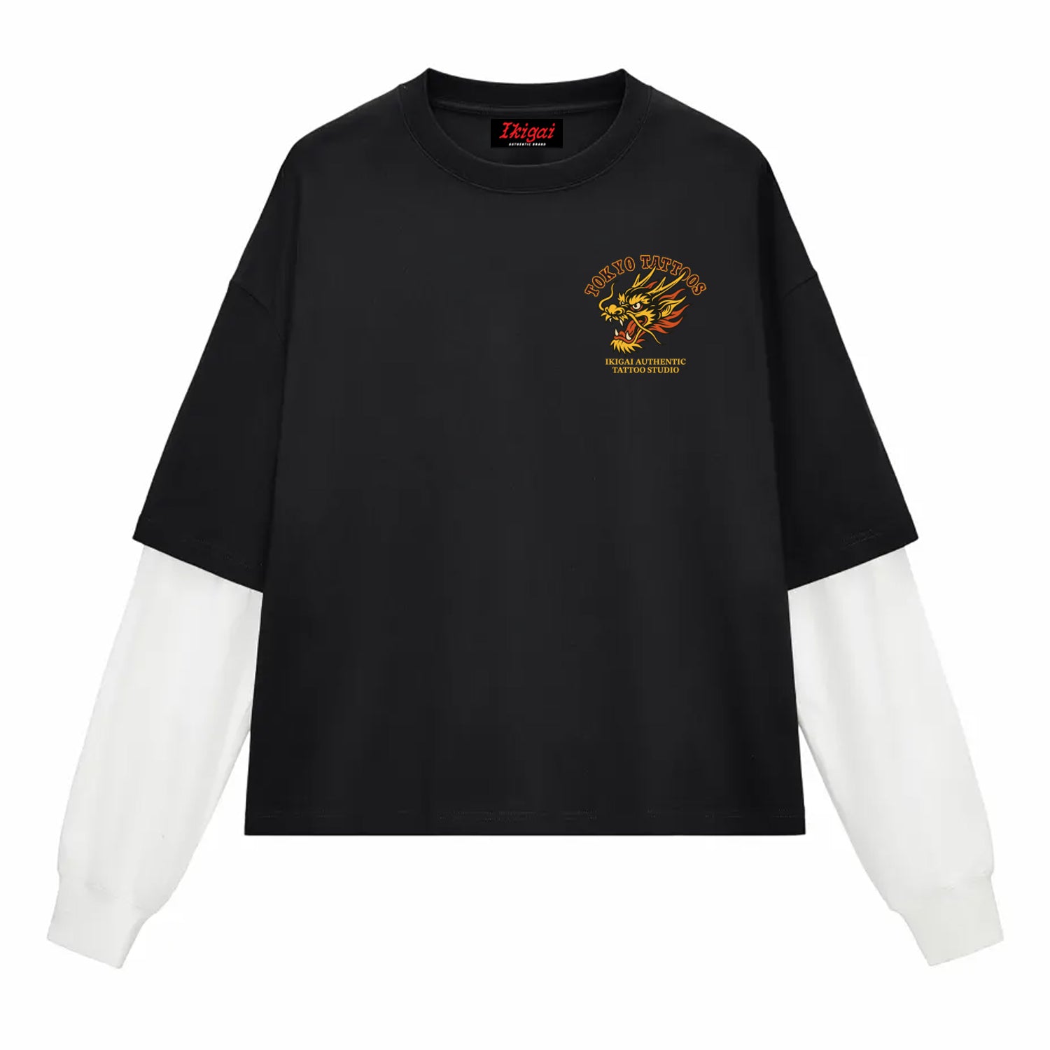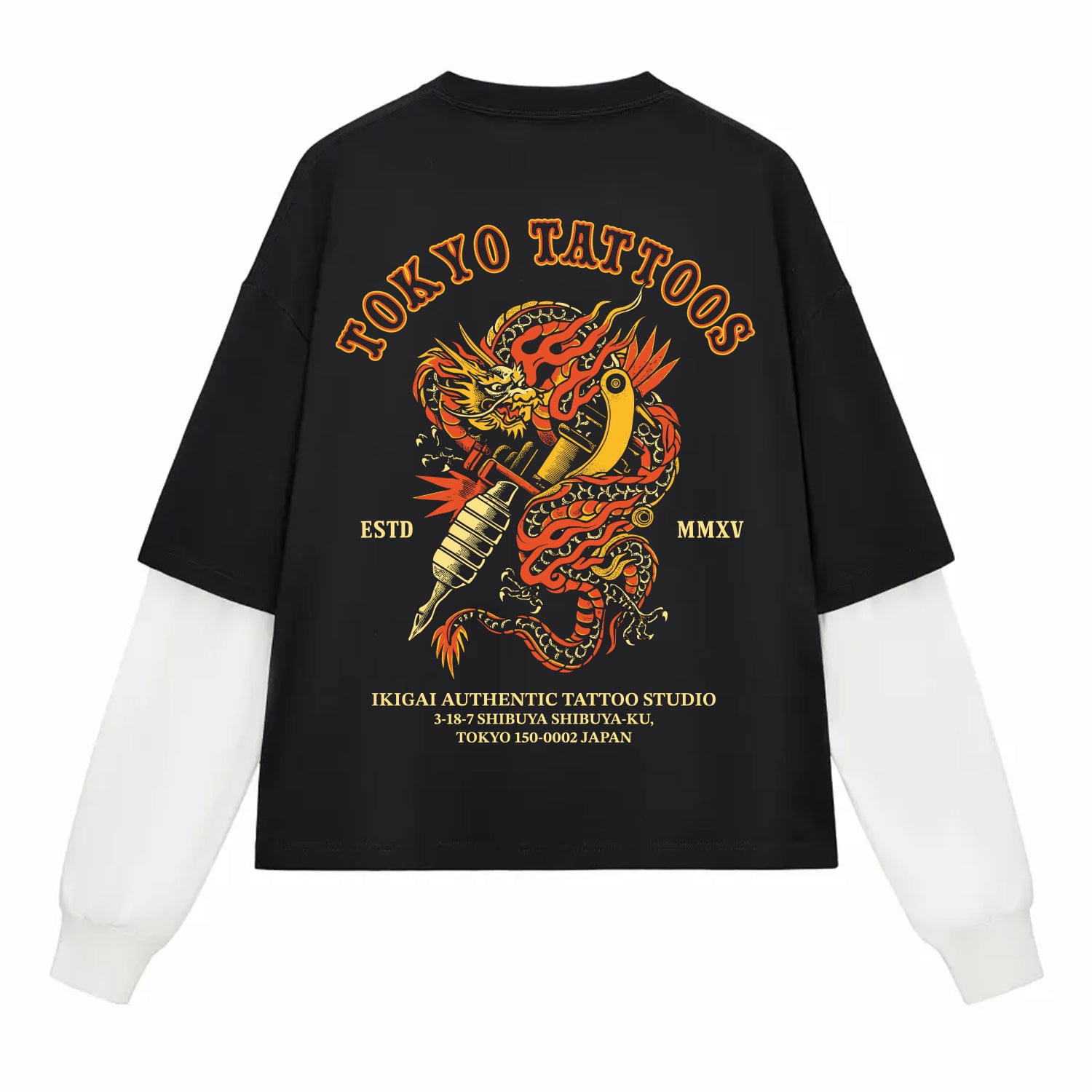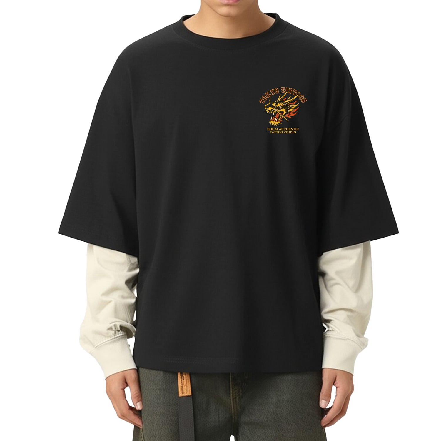 Tokyo Tattoo Studio Layered Contrast Sleeve Cotton T-Shirt