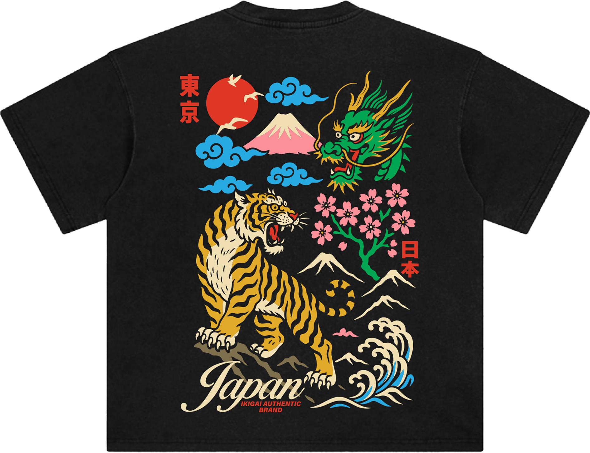 Bring Japanese legends to life with this vibrant Tiger & Dragon Tee, featuring bold traditional artwork of Mt. Fuji, sakura blossoms, and crashing waves. Striking colors and kanji details make this a standout piece for streetwear and art lovers. Crafted from premium cotton for lasting comfort and style.
